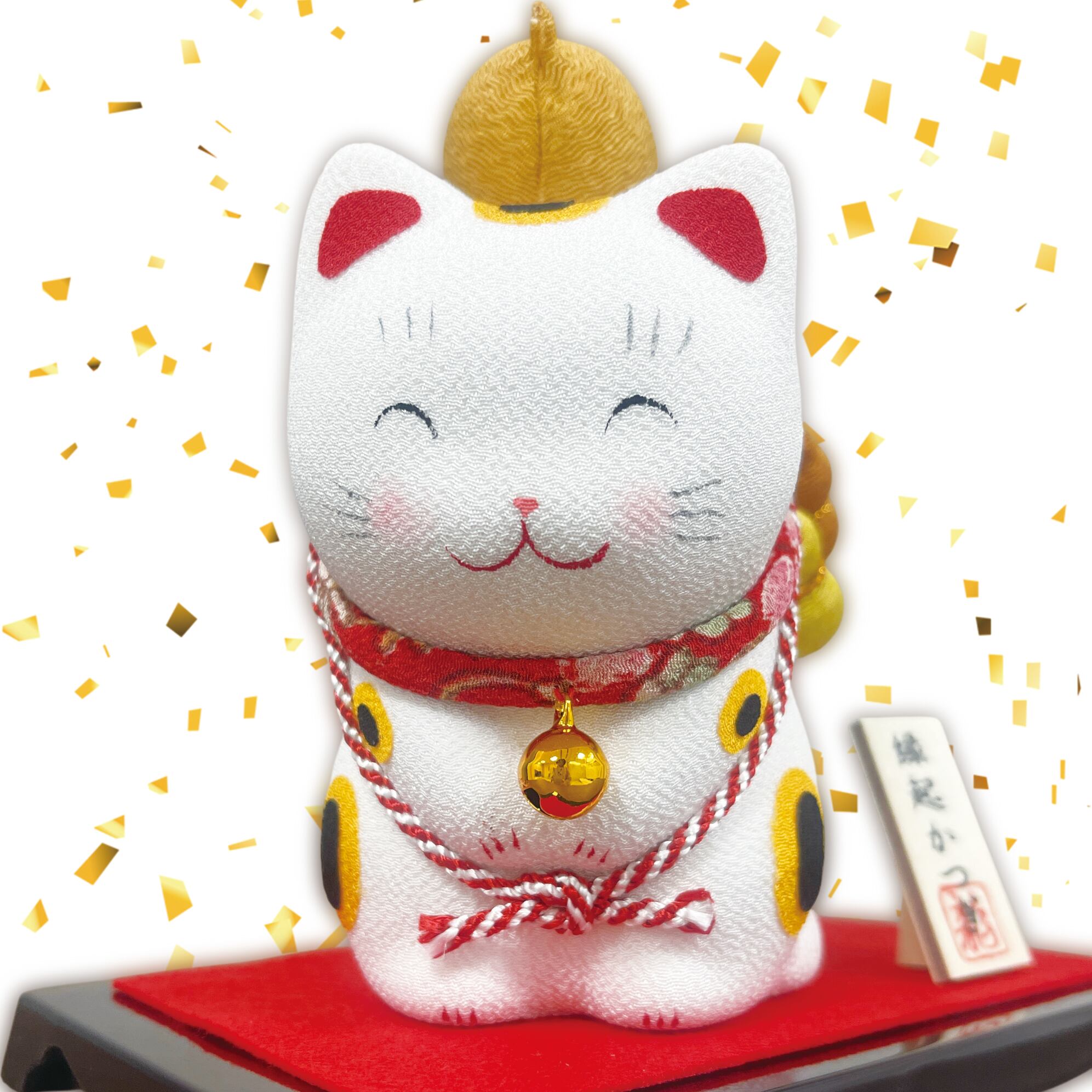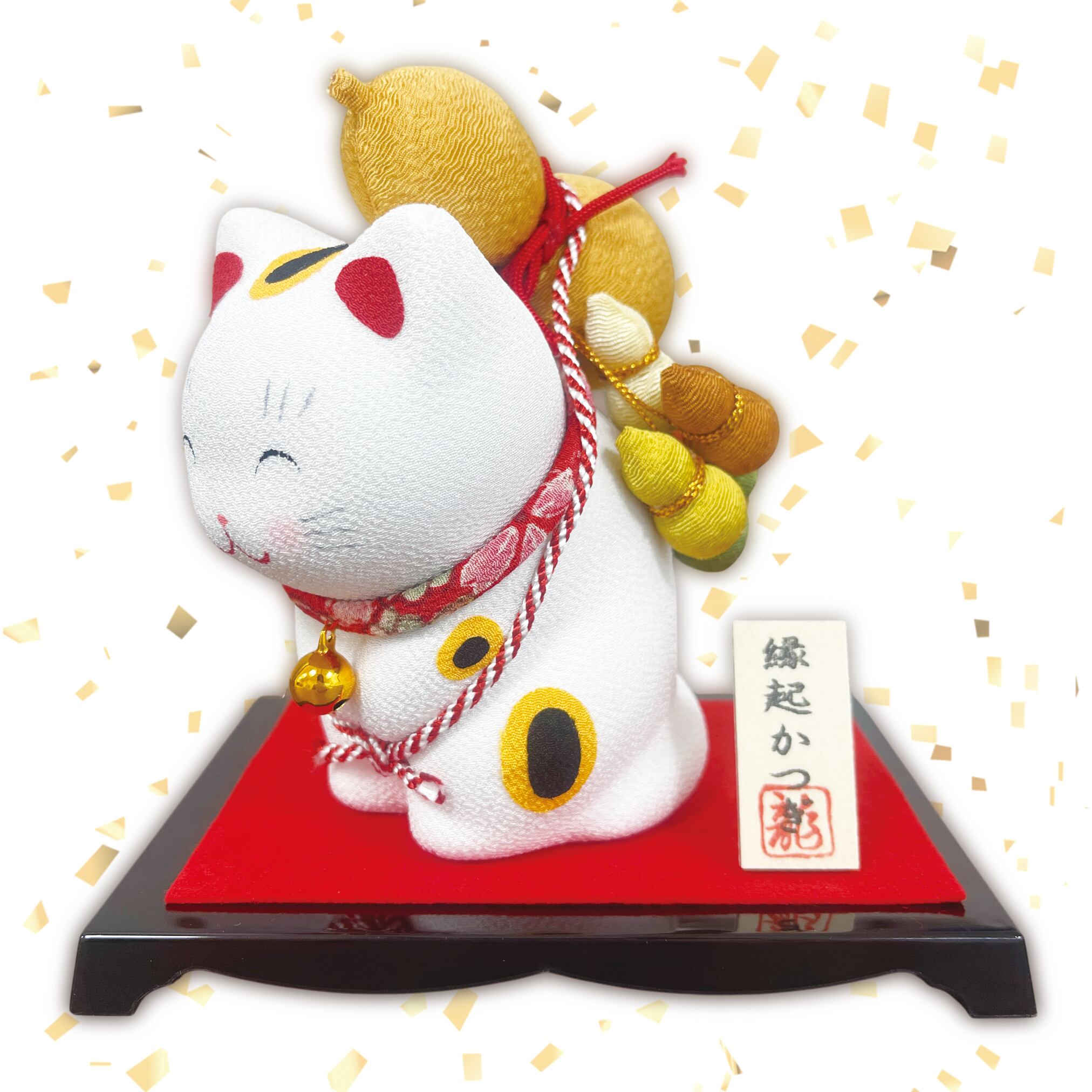 縁起かつぎ招き猫 六瓢箪 台付き手作りちりめん細工