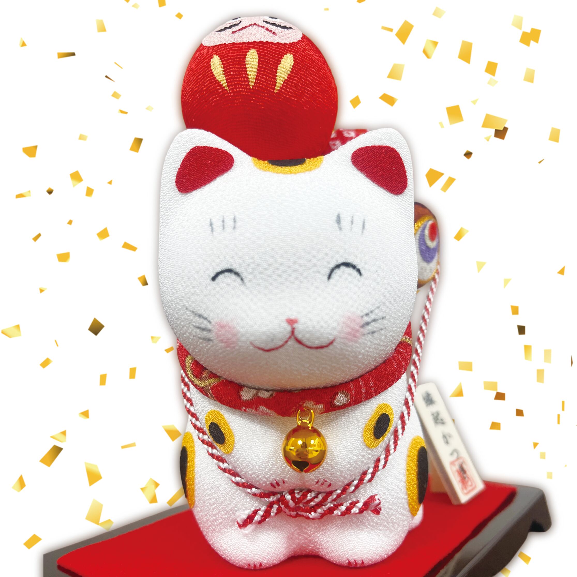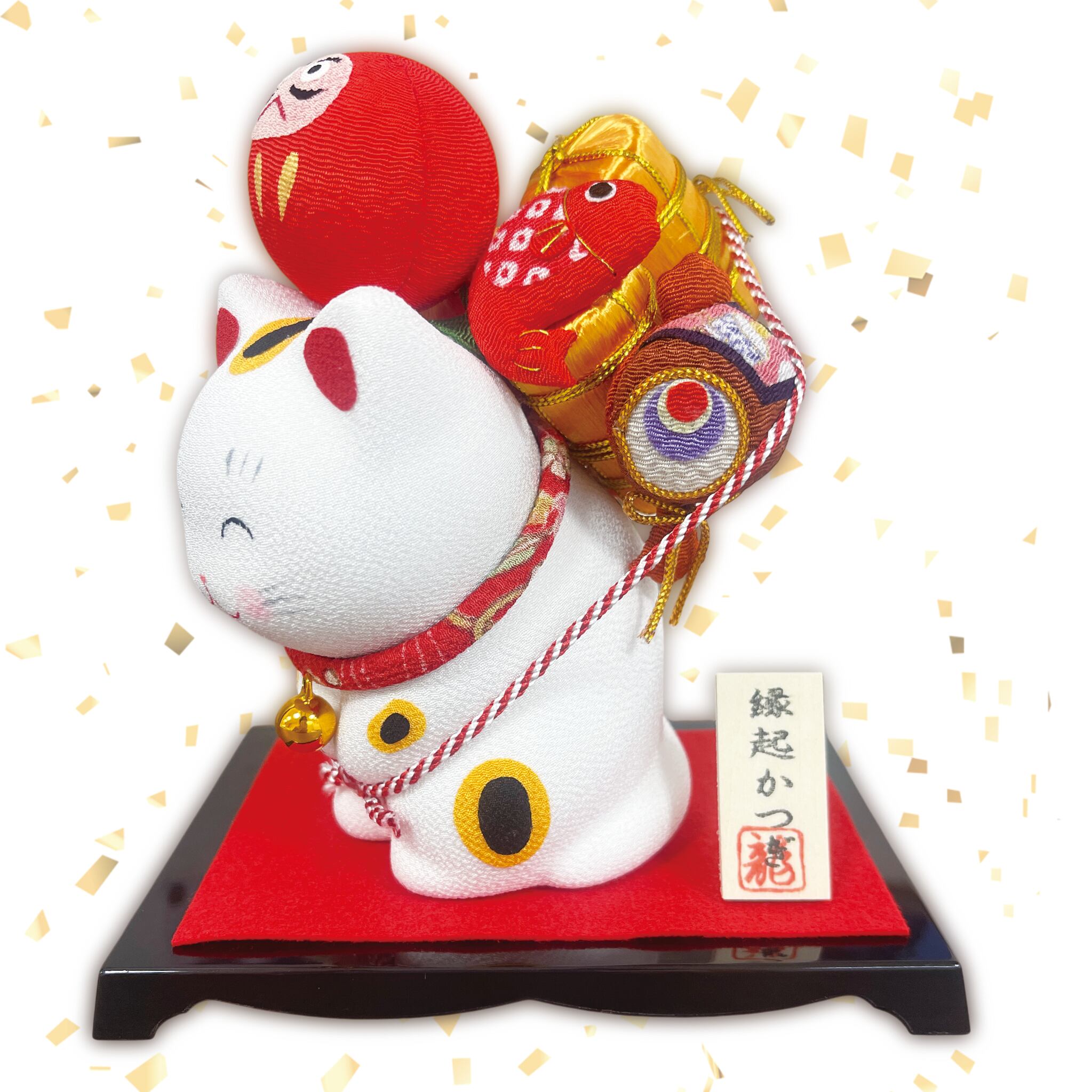 縁起かつぎ招き猫 縁起尽くし 台付き手作りちりめん細工