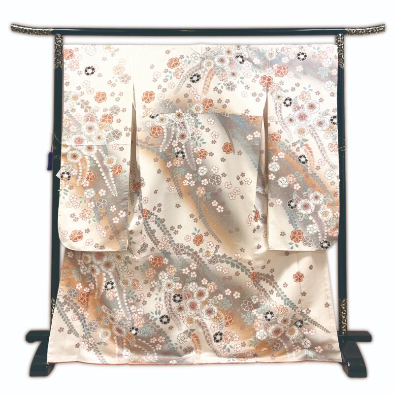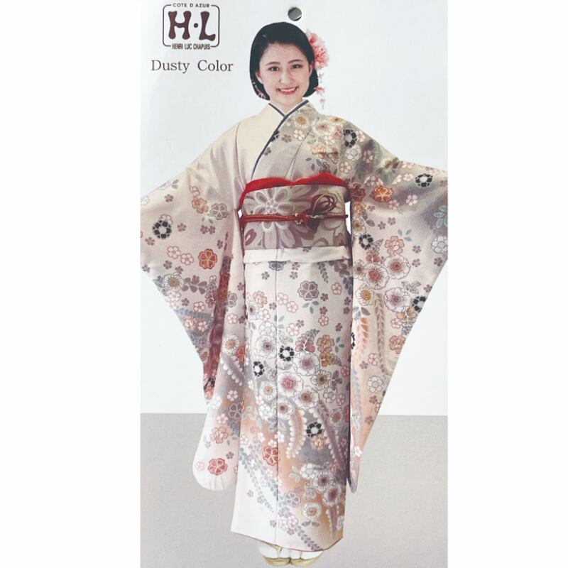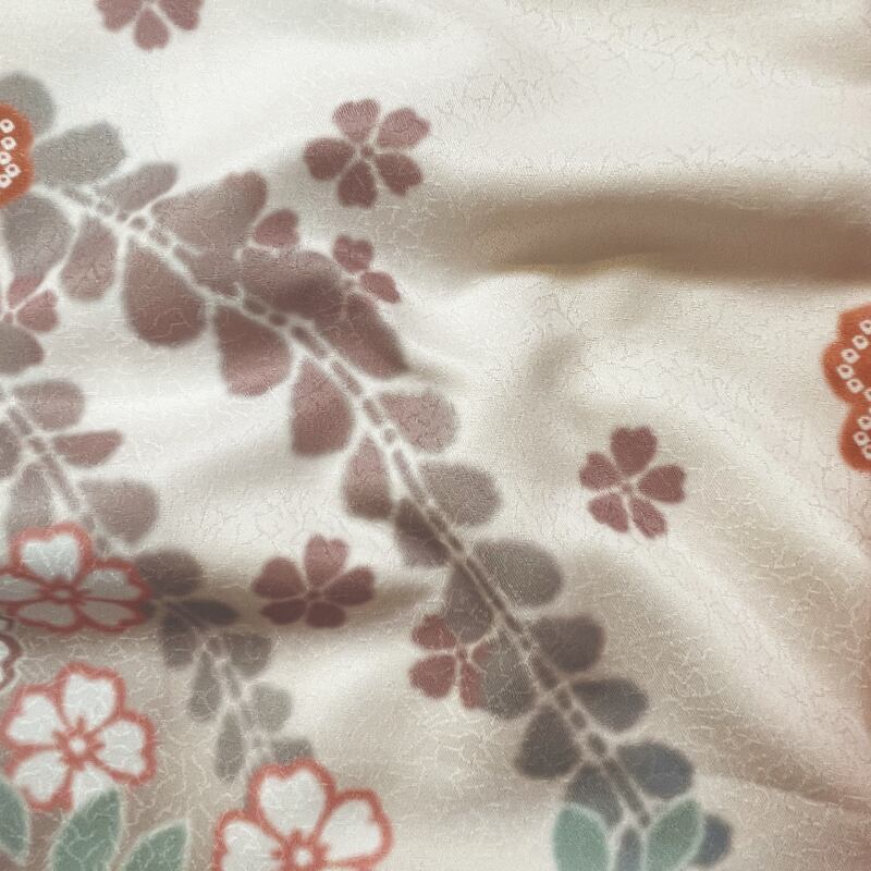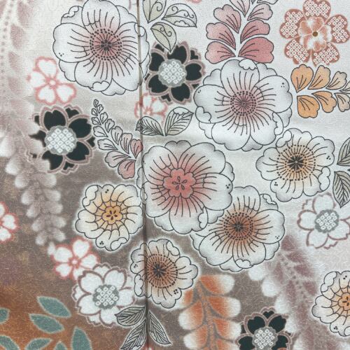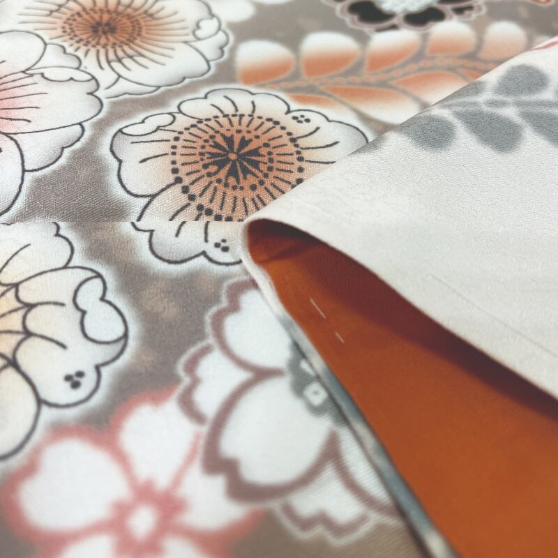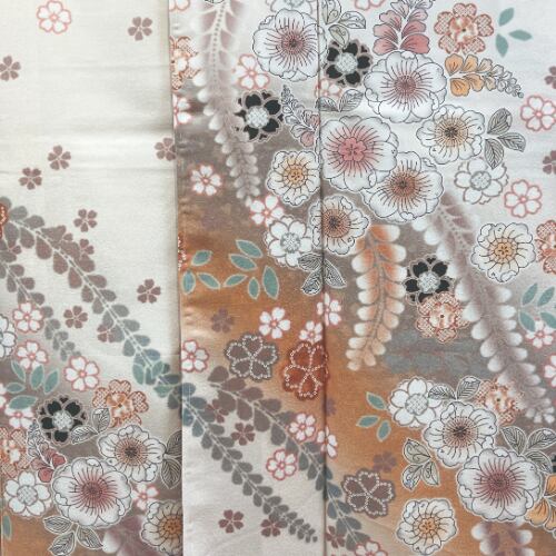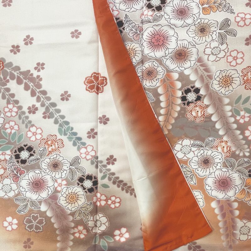 淡いオレンジ色地に、桜や藤などの花々を全体にあしらった、清楚さと華やかさを兼ね備えた振袖です。ダスティーカラー(グレーみを帯びた色)を基調とした、白い花文様に墨色をアクセントとして用いることで、甘くなりすぎず、上品で落ち着いた印象に。流れるような柄付けが、立ち姿を美しく引き立てます。