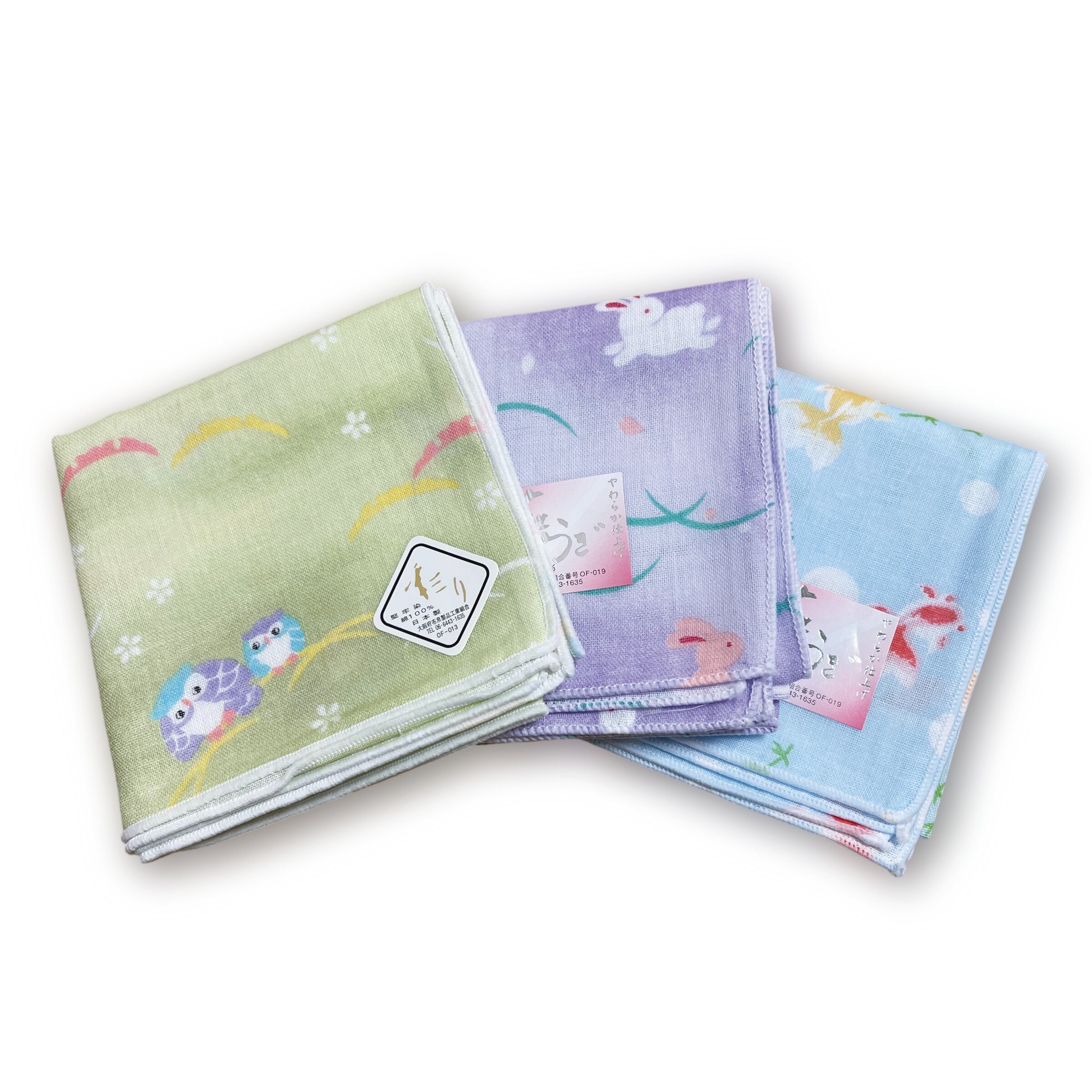 柄:ふくろう(グリーン)・うさぎ(パープル)・金魚(ブルー)