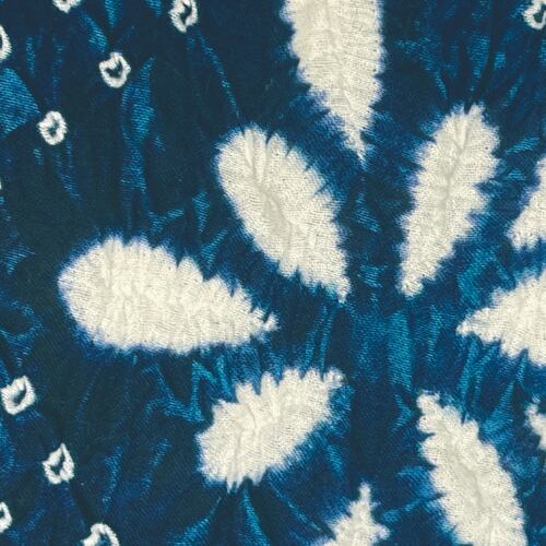 深みのある青地に、繊細な絞りで表現された緑色の花火柄が優しく浮かび上がり、個性的かつ落ち着いた大人の雰囲気を感じさせます。